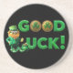 A funny Leprechaun in a green suit with a red beard and a gold coin in his hand wishes you good luck!