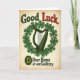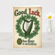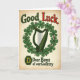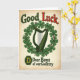 Designed with a nostalgic poster look, this St. Patrick’s Day card centers on a Celtic harp in deep forest green, hugged by a wreath of shamrocks that feels like a close, supportive embrace 💚. The setting is a warm, aged cream background with worn edges and tiny specks, like paper that’s been carried in a pocket for years. At the top, the words “Good Luck” sit proudly, with “Good” in dark green and “Luck” in a strong red that catches your eye right away ☘️. Below the harp, “Dear Boys of our Country” is placed in a darker green, reading like a gentle send-off to friends heading out together. The shamrocks curl around the harp in a way that suggests care and loyalty, like a quiet promise between companions. Near the lower area, a dark green octagonal badge holds a golden “D,” adding a small, official-looking mark to the design. The harp strings and leaf shapes are drawn with smooth lines that stand out against the faded, timeworn cream paper and softly weathered corners.