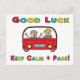 Good Luck Driving Test shows a learner driver taking their test with a Good Luck message and a Keep Calm and Pass hint below. A fun design for those about to take their test.