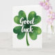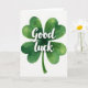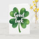 This card features a watercolor-style four-leaf clover centered on a bright white background, its heart-shaped leaves arranged evenly like a small green bouquet. Deep emerald tones gather near the middle where fine veins meet, then fade into softer, lighter green along the edges for a fresh, airy look 💚. Across the clover, the words “Good luck” sit prominently in white lettering, standing out clearly against the greens. The text has smooth, flowing strokes and a faint shadow that makes it look slightly raised above the painted leaves. With no characters in the scene, the clover itself becomes the friendly stand-in—like a small token you’d pass to someone you care about, close and reassuring ☘️. The open white space around the plant keeps the focus on the clover and the centered phrase without any extra objects or patterns. The stem angles gently downward beneath the leaves, and the pale green edges look almost translucent against the white.