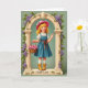 This greeting card shows a wide-eyed young girl standing inside a cream-colored archway, her golden curls spilling out from under a bright pink sun hat dotted with tiny blossoms. She wears a blue pinafore over a crisp white blouse with lace at the collar and cuffs, and her rosy cheeks and blue eyes give her a sweet, friendly look that feels like she’s greeting someone she cares about 💚. In her left hand, a woven basket brims with soft pink flowers, while her right hand lifts in a small wave, as if welcoming a close friend. Green vines and clusters of deep purple blooms climb around the arch, set against a muted sage background that keeps the focus on her face and the flowers ☘️. Near the bottom, the words “Good Luck” appear on the arch’s base in dark lettering that stands out against the pale stone. Soft, diffused light smooths the textures of the fabric and petals, and her mustard-yellow boots anchor her at the center of the scene. The cream arch frames her neatly, with purple blossoms tucked along the sides and vines curling toward the top.