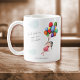 Oh the places.... Good luck in your new adventure mug with an illustration of a brunette girl floating away with colorful balloons. Perfect for retirement and farewell keepsakes. Illustrated and designed by Patricia Alvarez.
