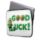 A funny Leprechaun in a green suit with a red beard and a gold coin in his hand wishes you good luck!