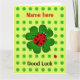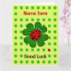Personalise this card inside and out: Add a name on the front, and customize the message inside (or you can use the ready-supplied text "Hoping everything goes well"). Lucky ladybugs and four-leafed clovers are the inspiration for this graphic design. A large red ladybugwith six black spots forms the centerpiece, and there is another tiny ladybug hidden in the four-leafed clovers of the soft green patterned background.