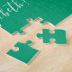 Light to dark green gradient jigsaw puzzle features "Good Luck, [NAME]" in a white script font near the bottom. Personalize the funny text in the sidebar. Makes a great custom gift for someone who loves a challenge.