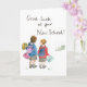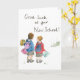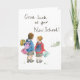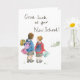 A 'Good Luck at Your New School' card that will go down well with anyone beginning school for the first time. A little girl and a smaller boy are standing at the foot of the steps into school with their lunchboxes and backpacks and the girl is carrying a bunch of flowers for the teacher and telling the boy about the wonderful time he will have at school. The design was handpainted in watercolours by Judy Adamson.