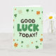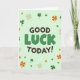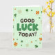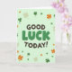 This card features the big message “GOOD LUCK TODAY!” centered on a soft mint-green background, like a gentle note passed between close friends 💚. “GOOD” and “TODAY!” appear in dark brown, while “LUCK” sits in the middle in bright green with a faint shadow that gives it a little lift. Around the words, small clovers drift in different sizes and angles, creating the feeling of someone sprinkling tiny tokens of care across the page ☘️. The clovers mix deep green with warm orange and creamy beige, adding variety without crowding the center message. The layout feels balanced and open, with plenty of breathing room so the text stays easy to read. The text is stacked in three lines, with “LUCK” taking the most space and drawing the eye first. Scattered near the top corners and along the sides, the clovers form a loose frame that guides you back toward the centered lettering.