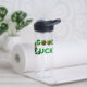 A funny Leprechaun in a green suit with a red beard and a gold coin in his hand wishes you good luck!