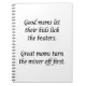 Funny design on this notebook reads, in black letters,"Good moms let their kids lick the beaters. Great moms turn the mixer off first." Great for a laugh and those with a good sense of humor or humour. Terrific gift for any kid. Fun for back to school.