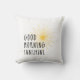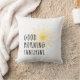 Good morning sunshine handwriting text with sunburst on the front. The back has a bold diagonal yellow hand drawn stripe pattern. Fun for any age or room.