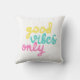 This throw pillow design features a playful "Good Vibes Only" message in bold, colorful text with a groovy vibe. The vibrant pastel colors of yellow, teal, and pink stand out beautifully against a solid white background, making the words pop. The lettering has a fun, handwritten feel, adding a touch of positivity and warmth to any space. Perfect for adding a cozy and cheerful vibe to your home décor.