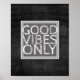 This good vibes only quote poster has white text on charcoal gray distressed background design for wall art decor in dorm,classroom,home, or office. Original art copyright Ann Powell all rights reserved.