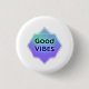 This is a graphic design featuring the text "Good" stacked above "VIBES" in a bold, black font. The text is centered on a stylized star or geometric shape with a gradient background transitioning from teal at the top to purple at the bottom. A subtle white glow outlines the shape. The overall message is positive and encouraging, aiming to convey a feeling of good energy and optimism through its simple design and uplifting text.