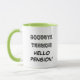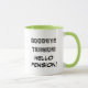 Retirement mug with funny quote | Goodbye tension hello pension. Cute typography design with custom message. Personalizable text for retired / retiring men and women. Custom background color. Funny saying for coworker, employee, boss, colleague, husband, wife, mom, dad etc. Office humor. Also available as large oversized coffeemug or big to go travel coffee mug. Appreciation recognition souvenir.