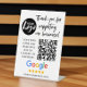 Modern, trendy Google Reviews Request pedestal sign. Design features trendy typography script '' thank you for supporting our business'' with your logo, website, google logo and qr code with review request.