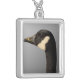 Shows the head and neck of a Canadian Goose against a gray tonal background.