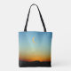 Gorgeous Glowing Moony Sunset Tote Bag. Keep yourself peaceful in this beautiful sunset with a sliver of the moon design with blues, greens, orange and reds.