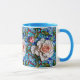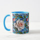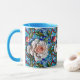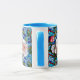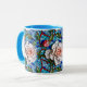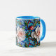 Gorgeous coffee cup with a striking blue and pink faux mosaic floral pattern, featuring vibrant blue, pink and red tiles, with coral-colored roses intertwined with green foliage. The intricate design mimics the look of a stained glass and ceramic tiles mosaic design, creating an elegant and timeless aesthetic.