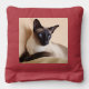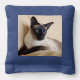 Beautiful blue eyes on this Seal Point Siamese Cat lounging, but alert on a taupe or camel colored throw blanket used as a background.