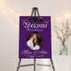 Welcome your wedding guests with this hauntingly romantic goth wedding welcome sign. An elegant, dark floral swag in purples and burnt orange tops the deep purple welcome. Your couples photo template is an oval. Vintage white text and script stand out to set the mood an extraordinary event. Let this dark Welcome to the wedding display be the centerpiece that beckons your guests into an immersive experience,