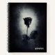 A dark and mysterious personalized spiral notebook with a cool illustration of a goth /emo style black rose with red dripping blood on its petals. A black grunge background with an off-white color in the center highlighting this moody and macabre rose.