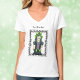 This tee shirt has a pretty Goth girl wearing a vibrant green hat with spiderweb and purple moon tattoos framed in black barbed branches. Customise your text with the template.