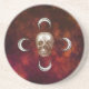 Goth Magik vintage skull illustration with four silver crest moons on red celestial background.