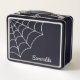 This goth style lunchbox has a simple spiderweb graphic in an ecru or eggshell white color with your name in matching script or cursive lettering.