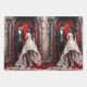 The image depicts a gothic couple dressed in wedding attire standing under an archway. The background is dramatically painted in shades of red, evoking a sense of blood splatter, which adds a dark and eerie atmosphere to the scene. The groom is wearing a black suit with a red boutonniere, and his hair is styled in a sleek, gothic manner. The bride is in a white dress adorned with intricate patterns, her long dark hair complementing the gothic theme. Both characters have pale complexions and an ethereal presence, further emphasizing the gothic esthetic. The overall mood is a blend of romance and macaber, characteristic of gothic art.