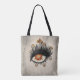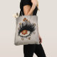 Goth bag with a digital illustration of a female eye with broken iris made of lava and long eyelashes ending in bizarre flowers with angled petals in a cloudy grey sky.