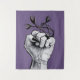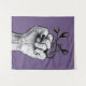 Witchy hand tapestry with an ink drawing depicting a hand in fist with sharp black fingernails and a black ring with evil monsters with sharp teeth over purple background. Fun creepy creepy illustration with a gothic feel.