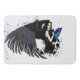 A gothic angel all in black is holding a black cat with blue fairy wings, The two of them are in a white backdrop with blue paint spatter, Black tribal flowers bordering the bottom of them