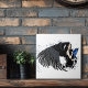 A gothic angel all in black is holding a black cat with blue fairy wings. the two of them are in a white backdrop with blue paint spatter. Black tribal flowers bordering the bottom of them