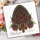 Gothic Archway with Skulls. Set against a mysterious, deep red background, a large Gothic archway rises majestically, decorated with ornate details. The two tall pillars, adorned with delicate carvings, lend the image a poignant elegance. In the middle of the archway shines an impressive stained glass window, the central motif of which is a spider a symbol of patience and creativity. Flanked by two golden skulls, reminiscent of both transience and eternal love, the archway captivates the viewer and promises a celebration full of mystery and fascination.