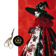 Her makeup is equally captivating, with dark, smoky eyes that add intensity to her gaze and bold red lips that complement the rich hues of her outfit. The wide-brimmed hat, adorned with a whimsical pattern and a flourish of lace, crowns her ensemble, adding height and a sense of theatrical flair. The overall effect is one of high drama and sophistication, making this image a true standout.