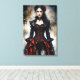 A stunning young gothic woman with captivating features black hair cascades. She is wearing black and red dress Gothic Punk Rave Long Coats Women Steampunk Victorian Retro Dress Brocade Jacket.