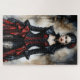 A stunning young gothic woman with captivating features black hair cascades. She is wearing black and red dress Gothic Punk Rave Long Coats Women Steampunk Victorian Retro Dress Brocade Jacket.