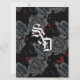 Striking black and red grunge texture as base for this goth design featuring a beautiful black roses. Victorian calligraphy in white create contrast and emphasizes the aesthetic. An opulent diagonal pattern of black roses over the same black red grunge textured background adorns the invitation's backside along with the couples initials.