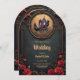 Gothic Carriage with Ravens and Roses. A gothic-style carriage being pulled by two ravens wearing top hats, set within an ornate, golden circular frame. The carriage is decorated with flowers and has a cross on top. The background is a dark, textured green, and the frame is surrounded by red roses and decorative golden flourishes. The overall mood is dark, elegant, and slightly whimsical.