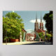 Photograph of the Old Town in Wroclaw, Poland. Two soaring towers of the Cathedral, a romantic bridge over the river, green trees and a lot of sun.