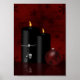Gothic Christmas illustration featuring black candles with silver skull decoration and a red christmas bauble with black skulls on a grunge red-black background with snowflakes.