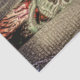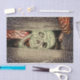 Gothic, creepy, green goth Halloween skull head peaking through wood craft decoupage tissue paper. Image copyright Marg Seregelyi Photography.