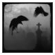 Gothic crows dance in the darkness of a old graveyard on Halloween night. This square photograph is in black and white with black edges making it more dramatic.