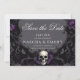 Save the Date with this unforgettable Gothic Elegance Purple Boho Skull Wedding Save the Date template featuring beautiful damask black and purple background. Tap "personalize this template" to add your own custom text.