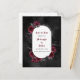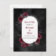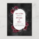Dark and moody save the date card with Till Death Do Us Part saying, dark red roses, bats and spider webs. Has a smoky black watercolor background. Blackletter typography adds to the gothic feel of the announcement. See our coordinating items as well.