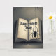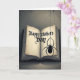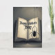 This card features an open, antique-looking book with creamy, textured pages glowing softly against a dusky gray background. Across the center of the pages, a large celebratory message appears in ornate black lettering, arranged in a few balanced lines. Above the words, a black silhouetted eight-legged creature hangs as if gently lowering itself, adding a teasing contrast that feels like an inside joke shared between close friends ❤️. A thin thread connects it to a finely detailed web that spreads in a neat geometric pattern across the upper right corner. Warm sepia tones in the paper and deep blacks in the figure and text create a tender push-and-pull between cozy and mysterious, like a romantic note tucked into an old book 🌼. Soft shading around the page edges makes the book look slightly raised, with light catching the paper grain. The web’s delicate lines and the creature’s long legs are crisply defined against the muted background, especially near the top right.