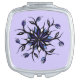 Gothic floral pocket mirror with a cool weird mandala illustration - digitally colored ink drawing of a strange flower with reptile monsters with sharp teeth in black, violet and blue colors.