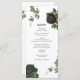 A Gothic Halloween script wedding design with black roses and hanging vines. A white Halloween design that uses black and dark botanical florals along with vintage script calligraphy typography. A stylish Gothic design ideal for Halloween wedding themes. A unique black roses wedding menu design. Matching wedding invitations and other stationery items are also available.