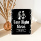Bring a spooky twist to your bridal shower with this Gothic Halloween Skeleton "Date Night Ideas" sign. Featuring elegant Gothic fonts and playful skeleton graphics, this sign invites guests to share their fun and eerie date night suggestions for the happy couple. Perfect for adding a unique touch to a Halloween-themed bridal shower, this sign is both stylish and haunting, setting the perfect tone for a memorable event.💀💀💀