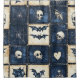 Dark gothic Halloween patchwork pattern shower curtain with denim texture, featuring skulls, bats, spiderwebs, and skeletons in stitched quilt-style squares. Perfect for gothic décor lovers, rustic spooky gifts, and Halloween party style.